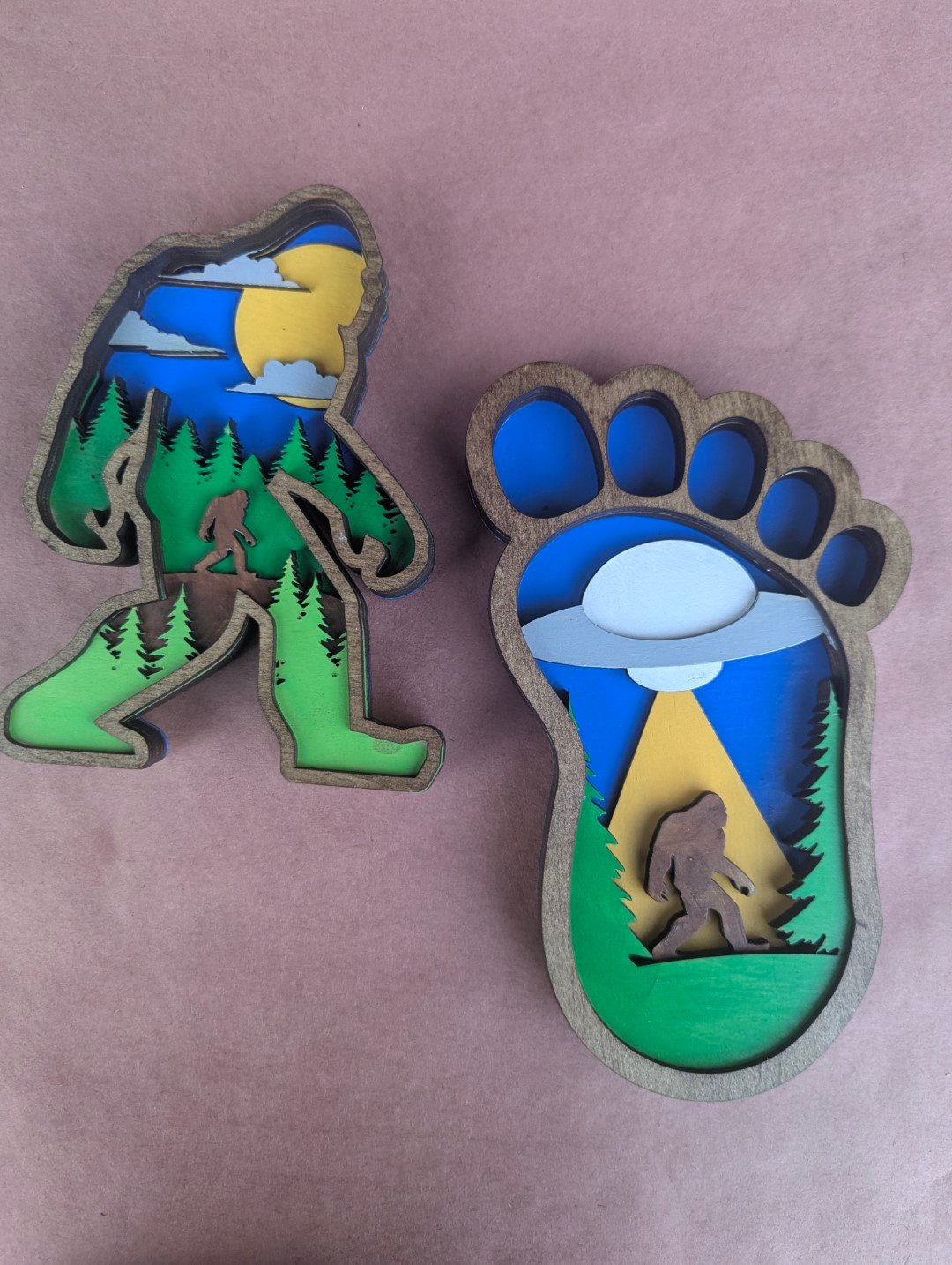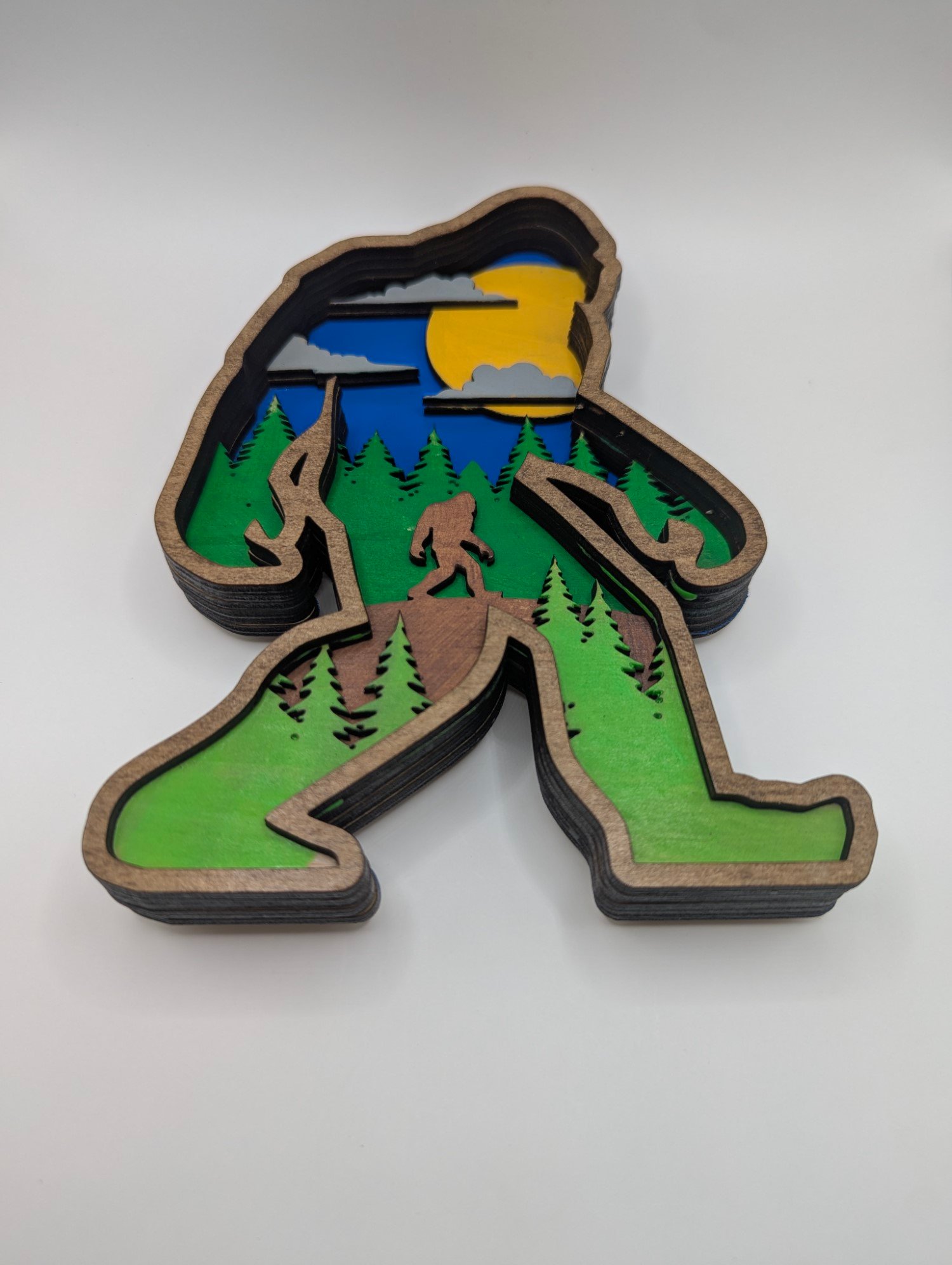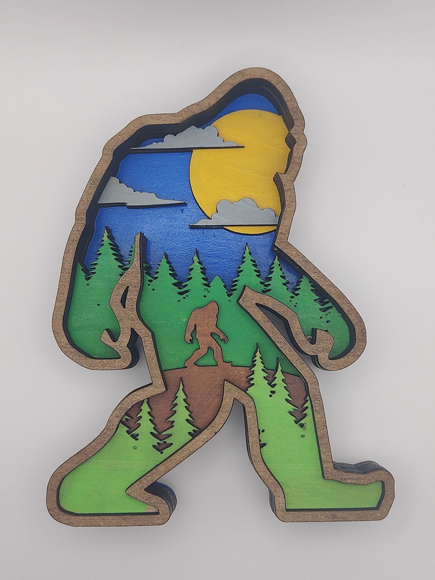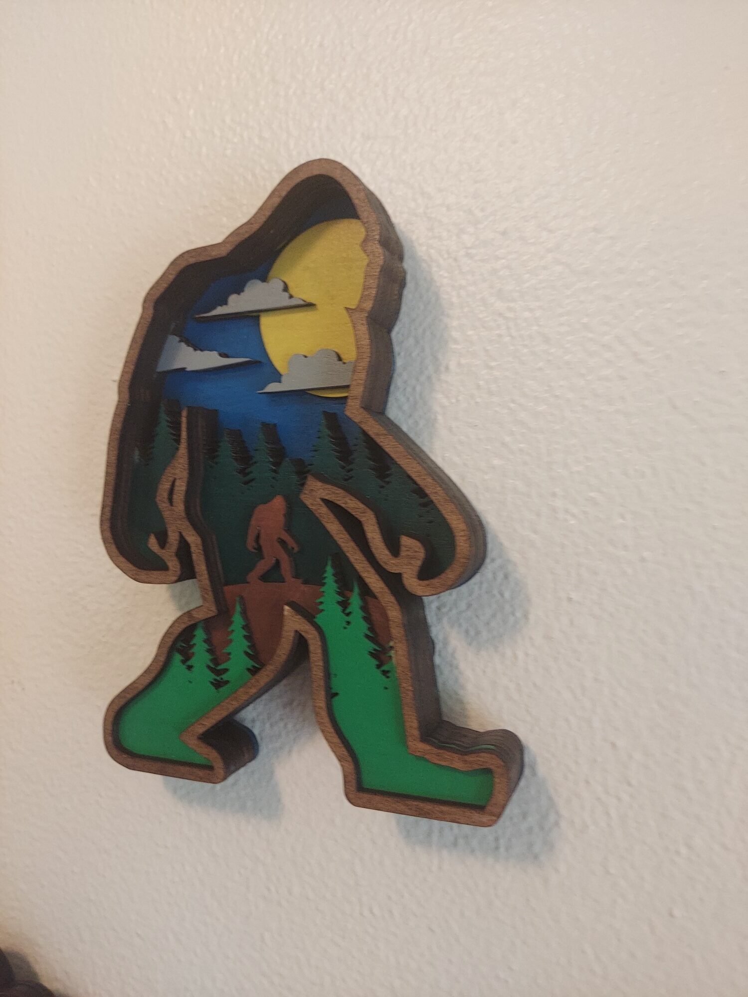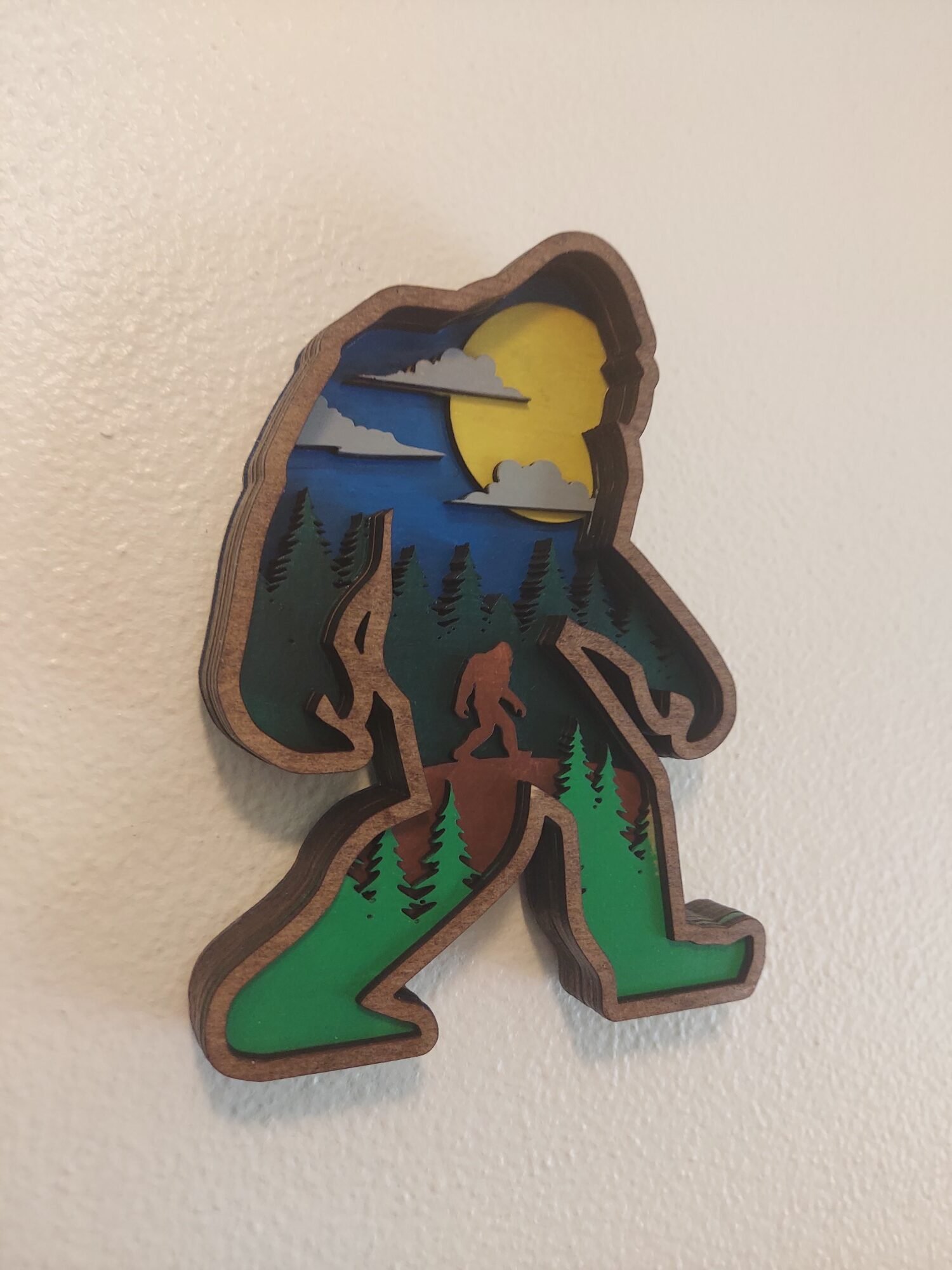 Bigfoot landscape layered art. Unique big foot wall hanger for all the sasquatch believers.Perfect cryptid gift for housewarming or birthday