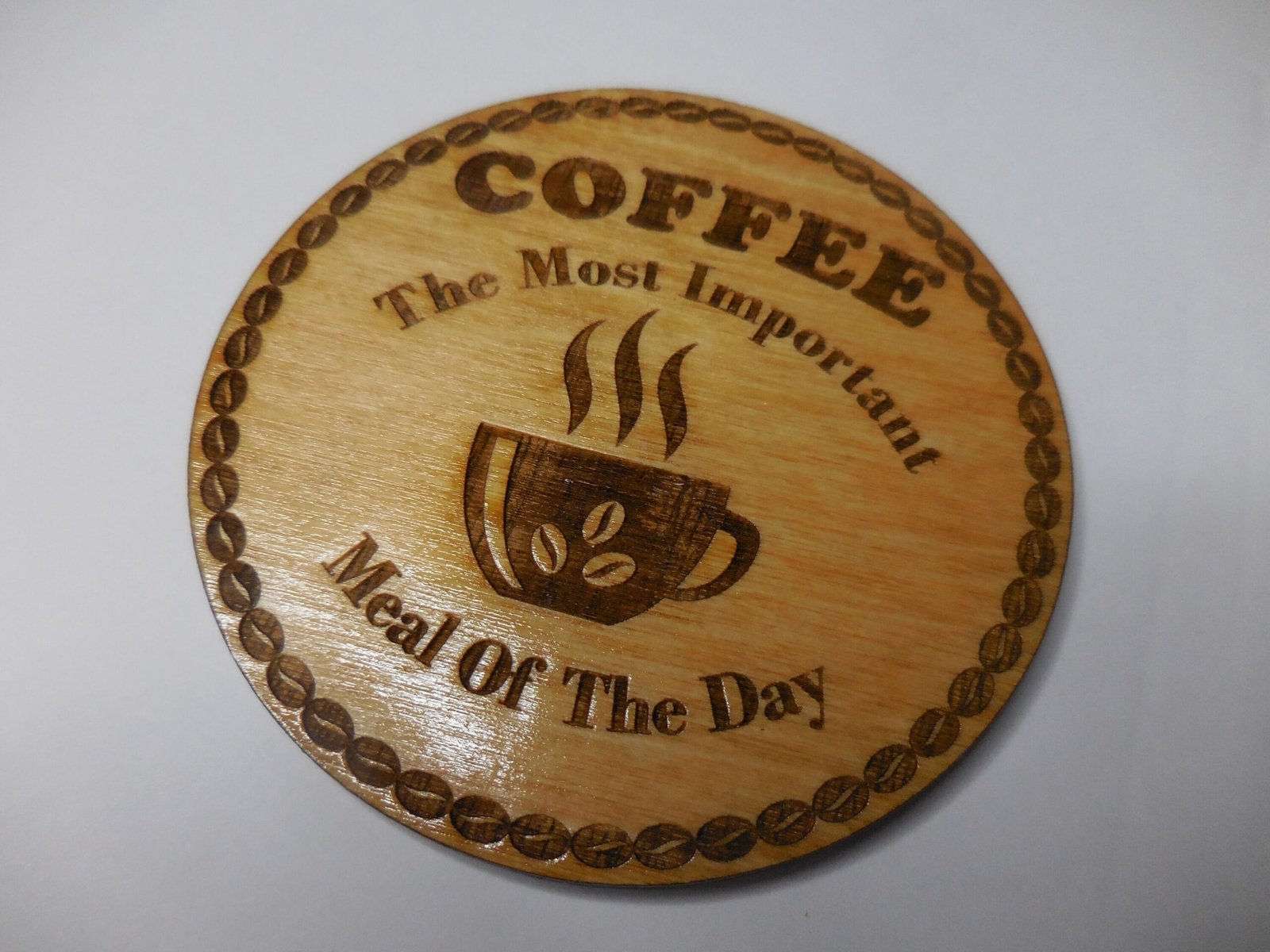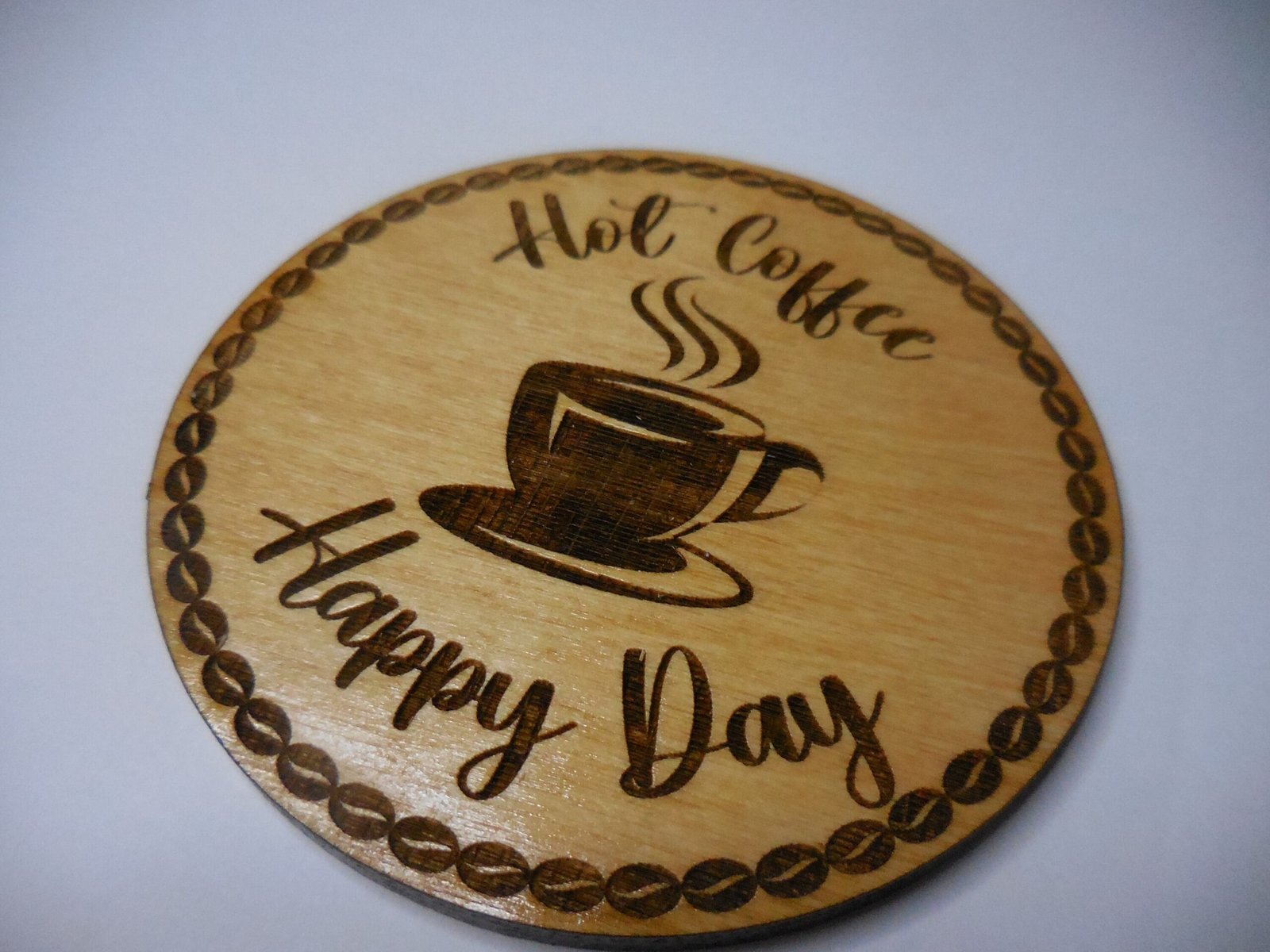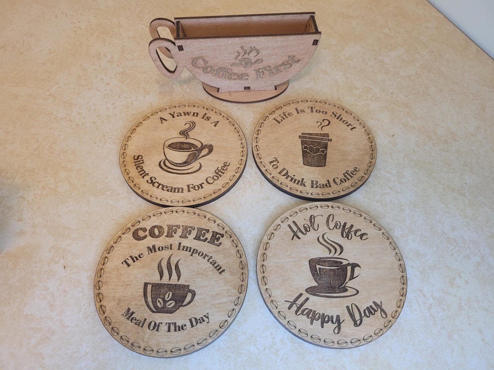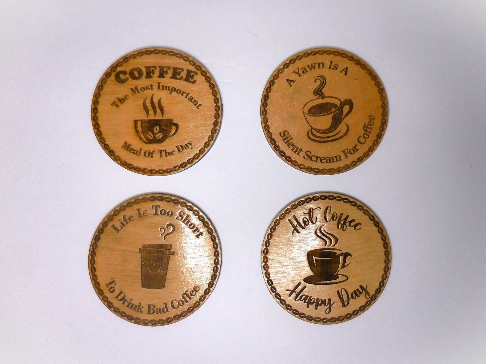 Plywood Protection: Coated with Urethane Coasters include the following four sayings (one of each): Coffee, the most important meal of the day A yawn is a silent scream for coffee Life is too short to drink bad coffee Hot coffee, happy day