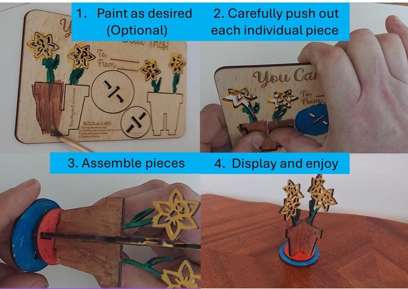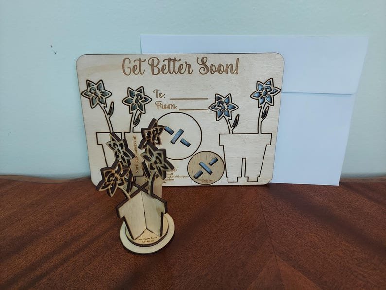 This unique flower 3D pop-up card is great for kids and anyone else that is in a hospital recovery or other illness. With multiple sayings to choose from, this is the perfect card for anyone. This card gives the recipient a quick and easy craft project that allows them to display beautiful wooden flowers when they are done.