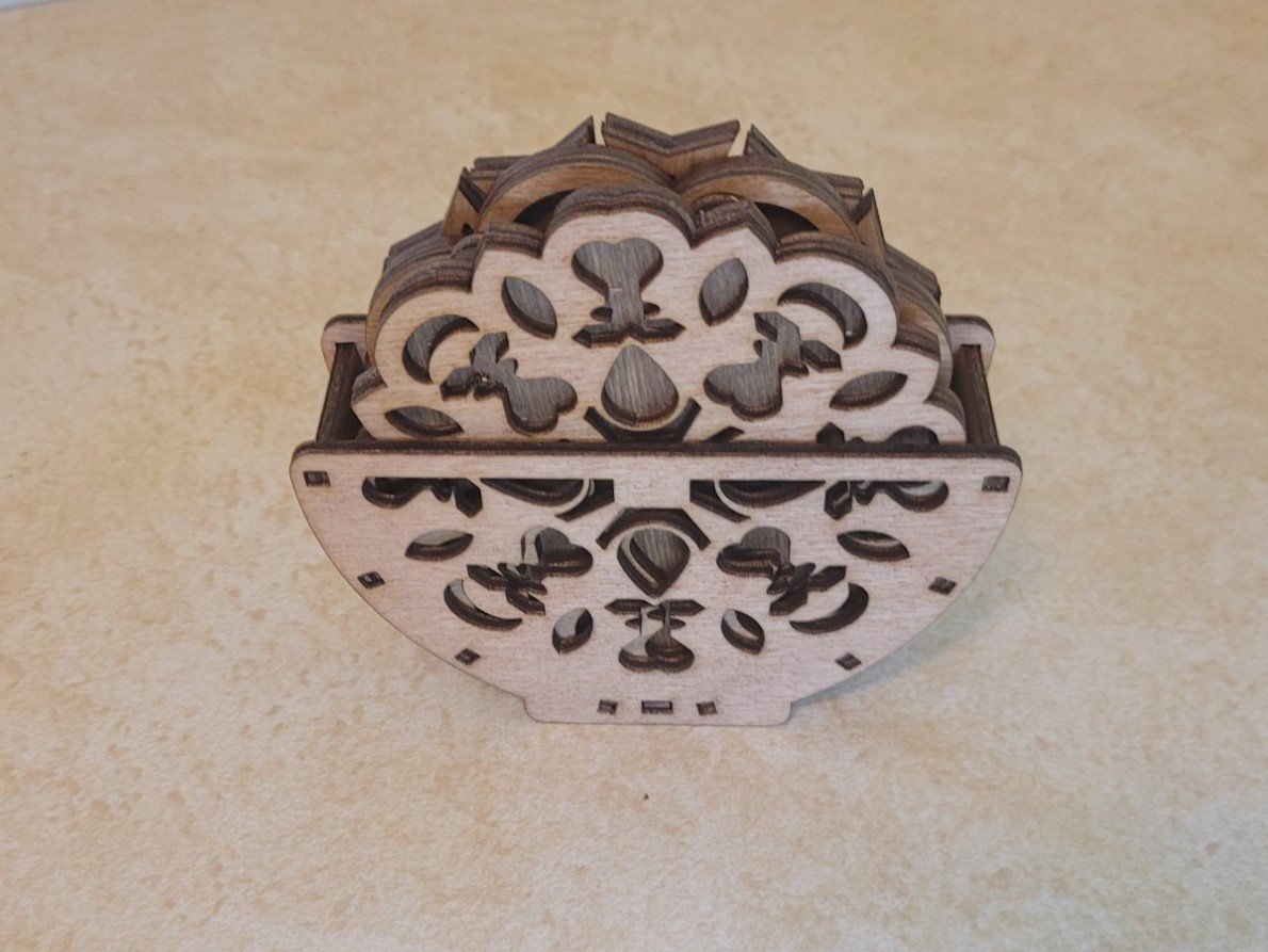 Add a touch of elegance and practicality to your space with this set of 4 laser cut wooden coffee coasters. Featuring intricate geometric mandala designs, these coasters are both beautiful and functional, protecting your surfaces while enhancing your decor. Made from high-quality, veneer wood, each coaster is carefully crafted using a laser cutting technique for precise detail and durability.