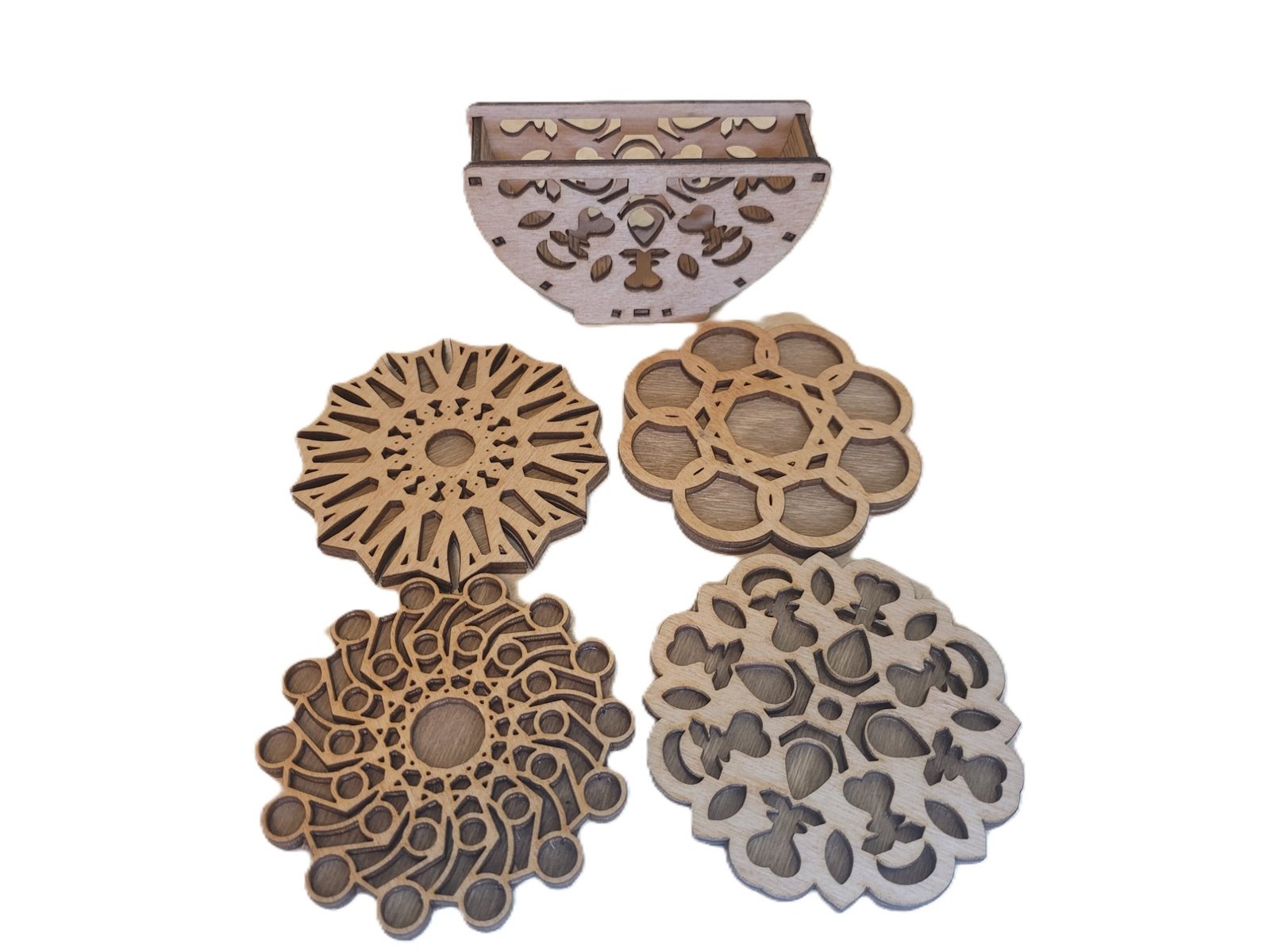Wooden Geometric Mandala Coffee Coasters with Holder design 1 – Set of 4 with holder – Stylish Laser Cut Coasters for Home & Office